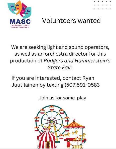 Marshall Area Stage Company is seeking light and sound operators, as well as an orchestra director for our production of Rodgers and Hammerstein’s State Fair.